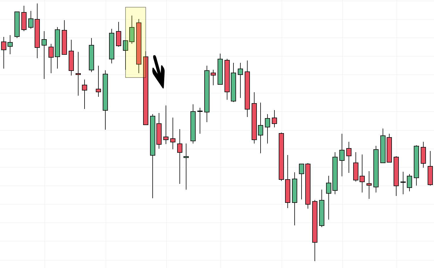 La bougie englobante, ou « avalement » qui signale un retournement (ici baissier) :